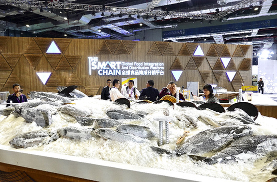 图为11月5日,参观者在食品及农产品展区全球食品集成分销平台参观。