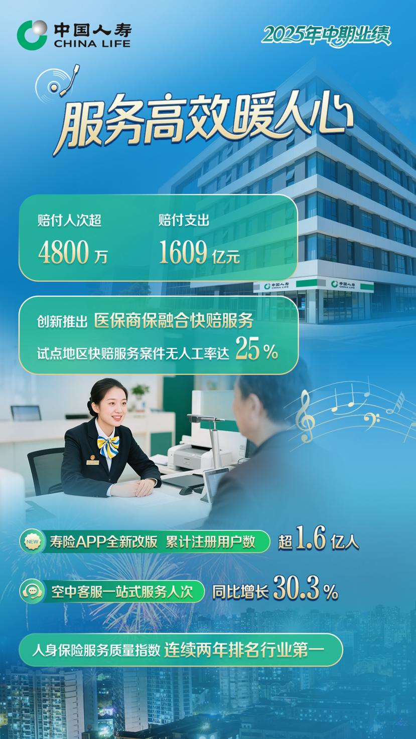 2025年上半年,中国人寿立足数字经济发展新阶段,以客户为中心、以数据为驱动,全面推进数字金融走深走实,创新应用人工智能、大数据、云计算等新技术,推动运营服务效率更高、触点更广、体验更优,持续厚植“简捷、品质、温暖”的“国寿好服务”品牌底色,以高水平数智化运营服务赋能公司高质量发展。
