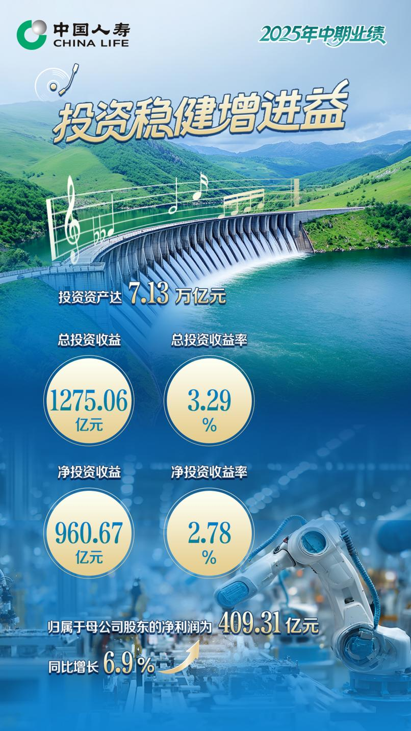 投资收益保持稳健提升。截至2025年6月30日,中国人寿投资资产达71271.53亿元,较2024年底增长7.8%。2025年上半年,实现净投资收益960.67亿元,净投资收益率为2.78%;实现总投资收益1275.06亿元,总投资收益率为3.29%。实现归属于母公司股东的净利润为409.31亿元,同比增长6.9%。
