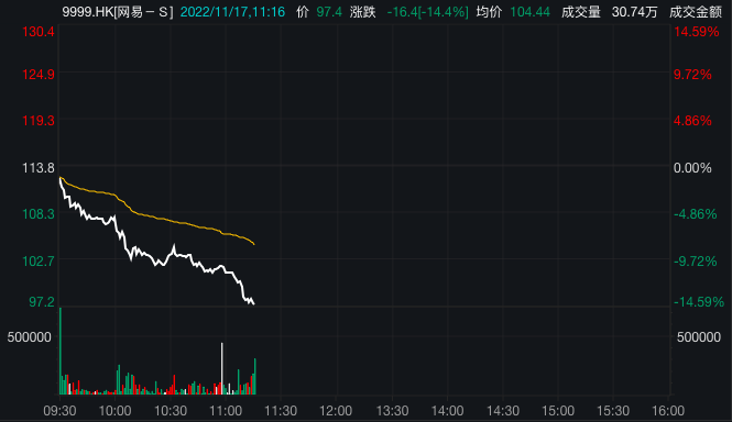 11月17日,网易早盘股价大跌。图片来自WIND