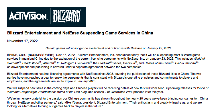 当地时间11月16日,暴雪娱乐发布声明,由于同网易的现有授权协议将在2023年1月23日到期,将暂停在中国大陆的大部分暴雪游戏服务,包括《魔兽世界》《炉石传说》《守望先锋》《星际争霸》《魔兽争霸III:重置版》《暗黑破坏神III》和《风暴英雄》。