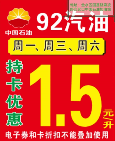 中石油郑州48站 E92汽油全卡折扣优惠1.5元/升,