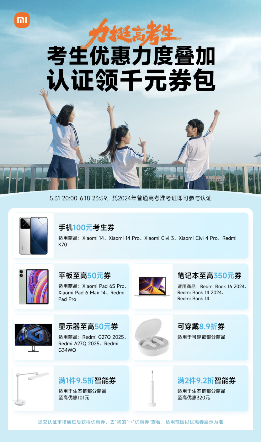 此外,正值小米618期间,为更好地助力高考,小米还特别推出了针对高考生的专属优惠券包,包括手机、平板、笔记本等,即日起至6月18日,前往河南小米之家, 高考生凭准考证完成考生认证即可领取。