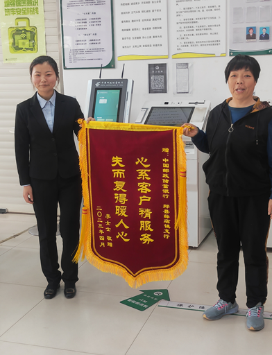 2023年4月14日上午,李女士来到薛店镇支行,赠送了“心系客户精服务,失而复得暖人心”的锦旗一面,表达了她对邮储银行服务贴心,对客户负责,对工作负责的感激之情。(薛原鑫)
