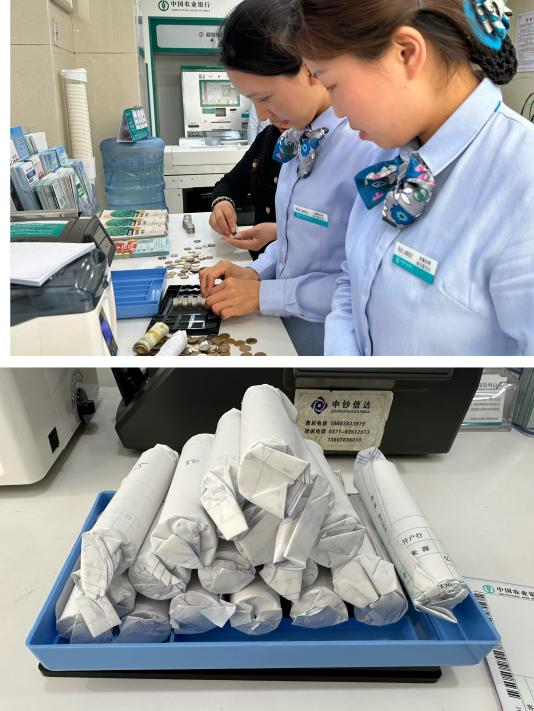 为提高清点效率,节约“老熟人”的时间,内勤行长随即召集“清分小组”到场,一人负责将硬币分类,一人负责计数,一人负责捆扎。