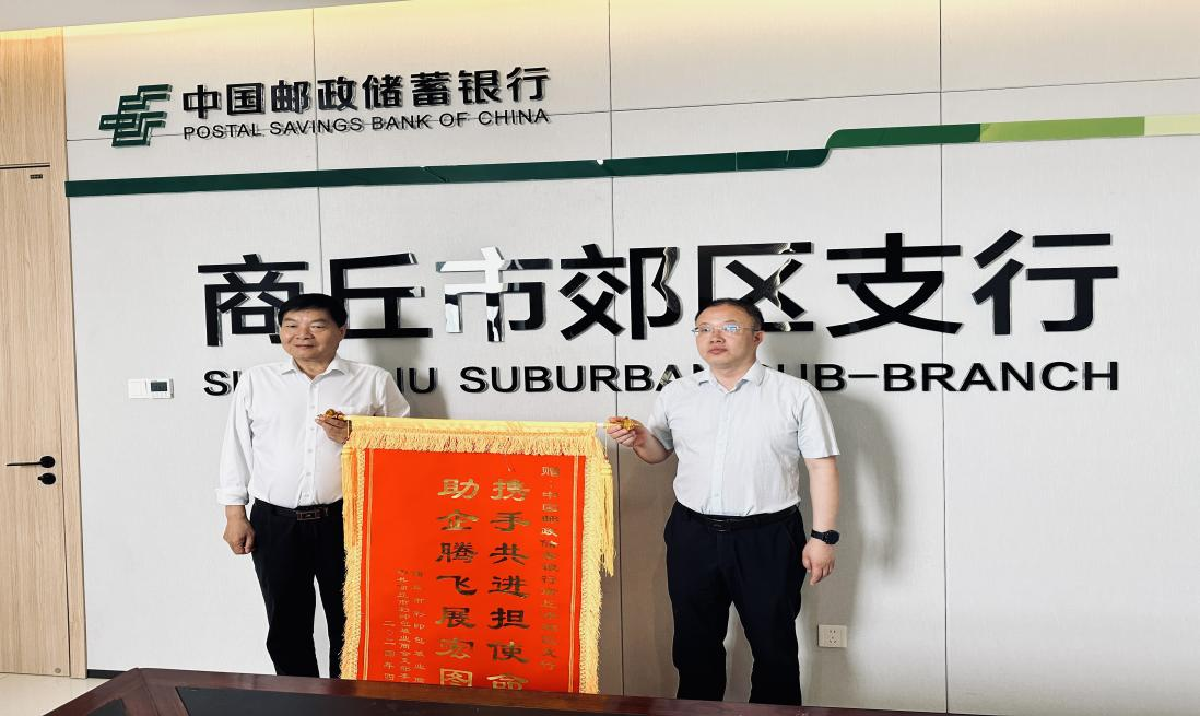 2024年5月9日上午,商丘市包装商会业商会陈会长一行来到中国邮政储蓄银行商丘市郊区支行,送来了一面写有"携手共进担使命,助企腾飞展宏图 "金光大字的锦旗,以此感谢邮储银行给予他们的帮助。