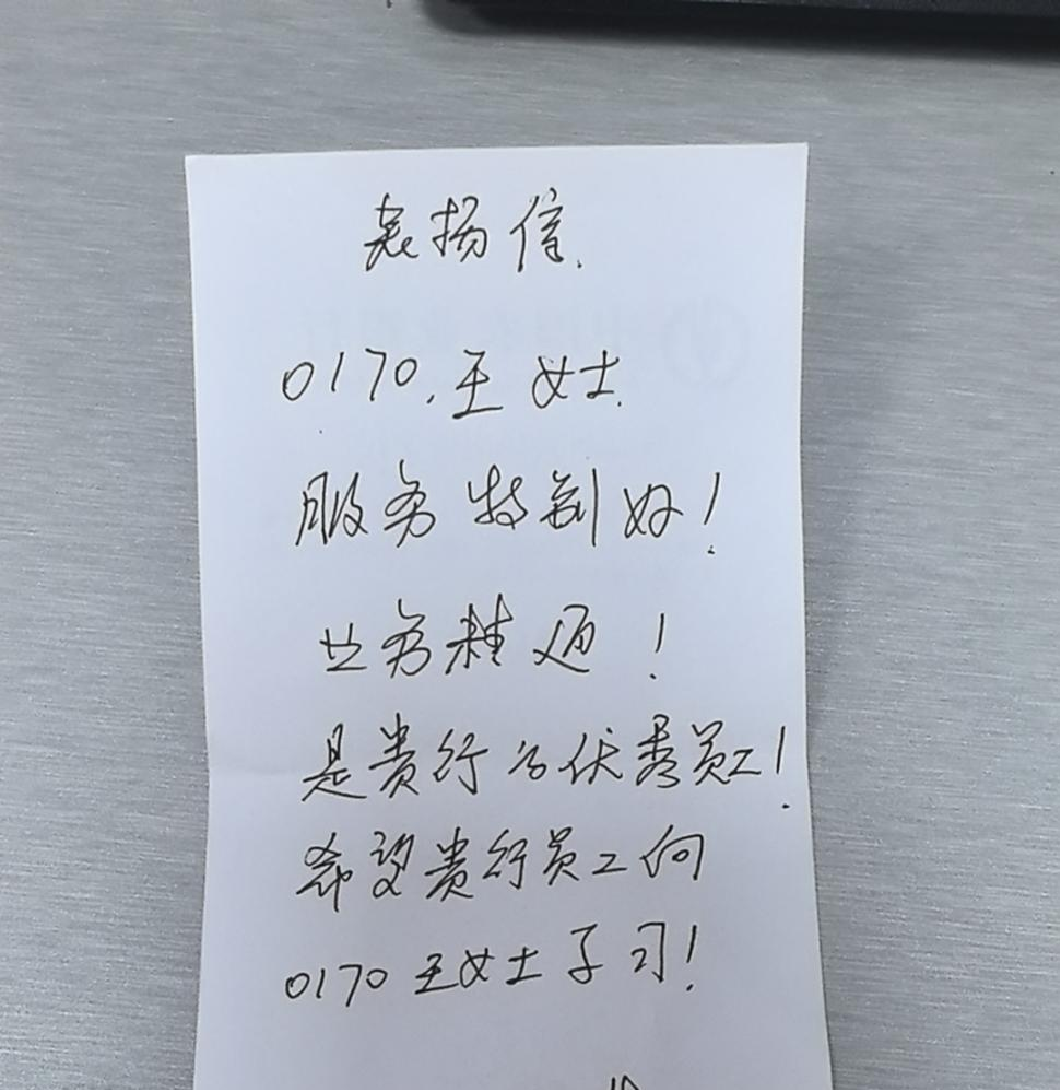 近日,农业银行郑州兴华南街支行客服经理王保琴收到一张客户亲手书写的表扬信。字里行间表达着对农行工作人员优质服务的认可。