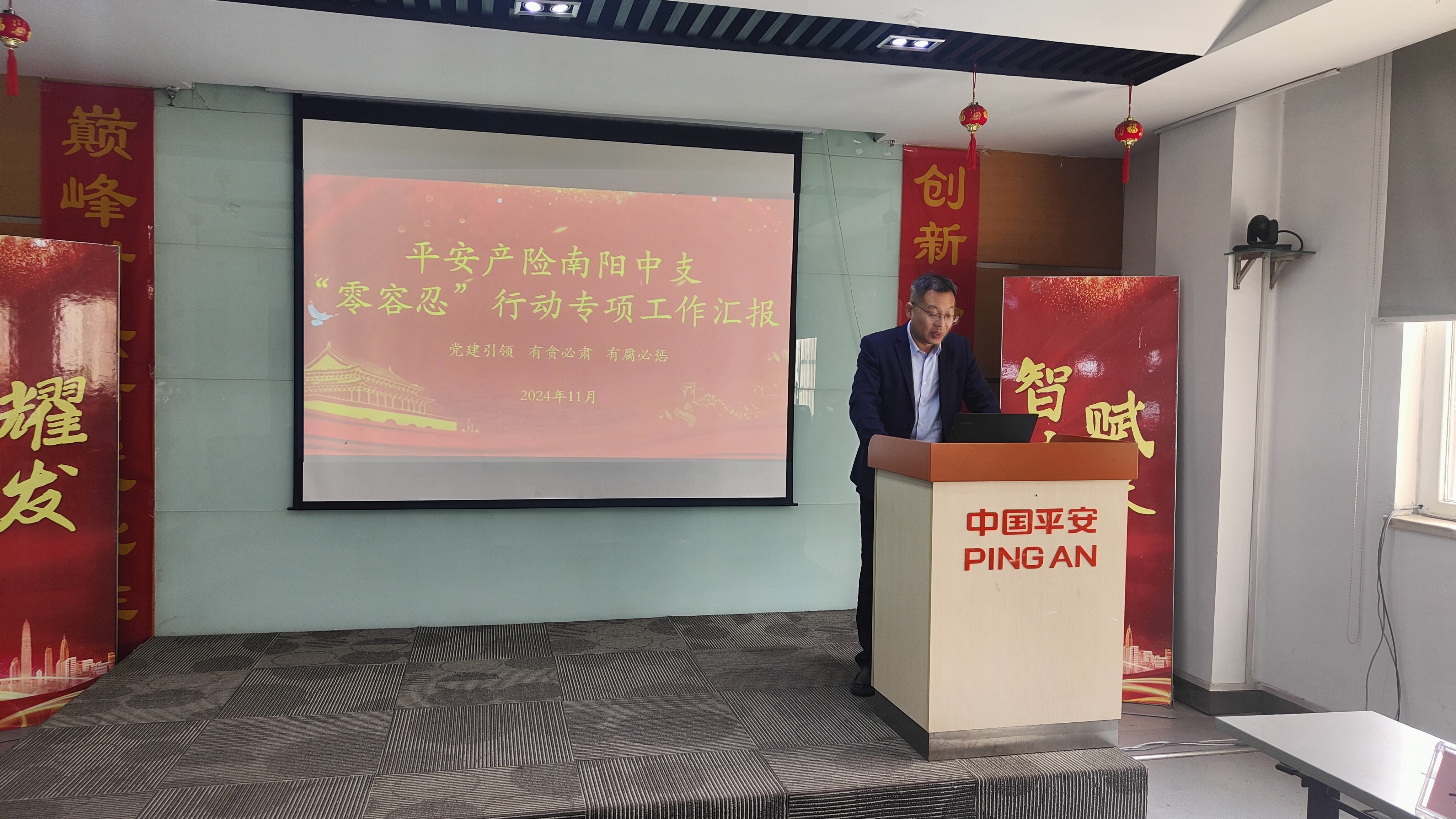 巡察小组听取了平安产险南阳中心支公司党风廉政教育工作和“零容忍”专项工作开展情况的汇报, 随后就党风廉政建设、规范销售行为、消保合规等事项开展现场检查和员工访谈。并重点提示合规工作无小事,要注意细节,持续开展从严治党、反腐倡廉工作,加强警示教育,做好自查自纠,不断加强合规文化建设。