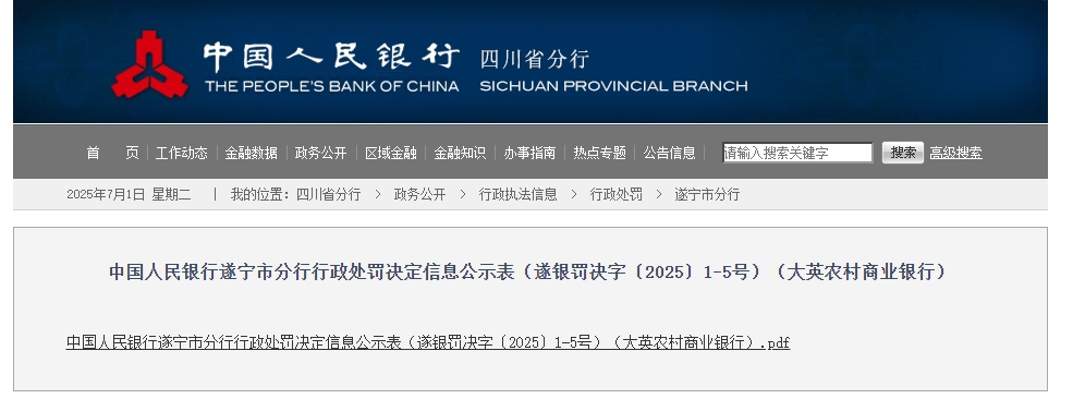 6月30日,中国人民银行遂宁市分行公示行政处罚信息,四川大英农村商业银行存在多项违法行为,被警告,并处罚款165.1万元,多名责任人同时被罚。