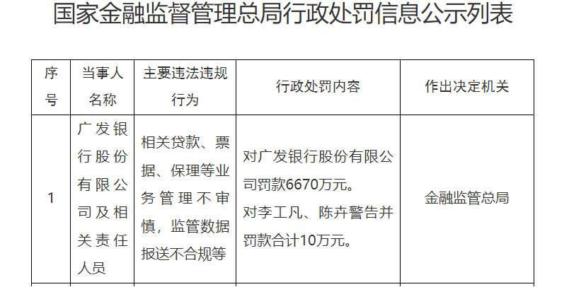 与此同时,同样因上述问题,另一家股份行广发银行也被罚6670万元。