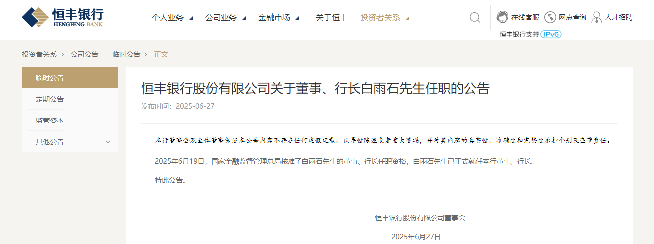 记者注意到,就在两个半月前,2025年6月末,监管部门正式核准白雨石恒丰银行董事、行长的任职资格,以及韩靖文恒丰银行副行长的任职资格。至此,恒丰银行空缺三年的行长职位终于补齐,43岁的白雨石也成为股份行中最年轻的行长。
