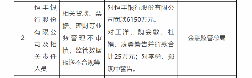 其中,因相关贷款、票据、理财等业务管理不审慎,监管数据报送不合规等违法违规行为,国家金融监督管理总局对恒丰银行罚款6150万元,对6名相关责任人警告,其中四名相关责任人合计被罚25万元。