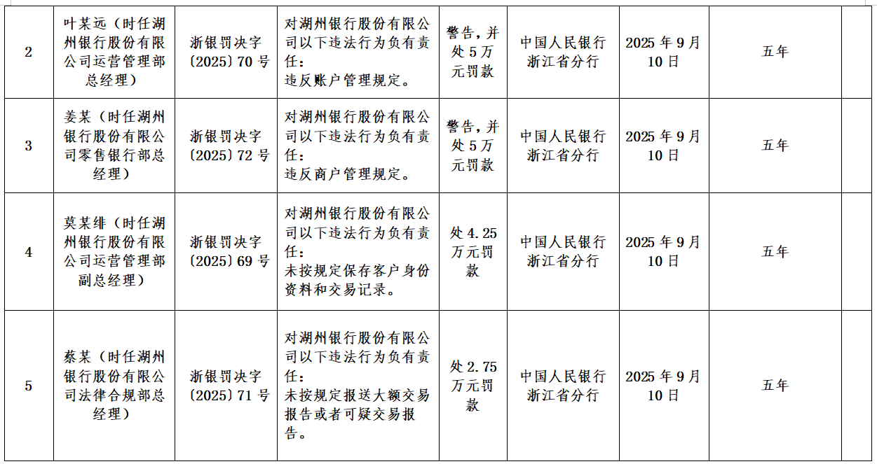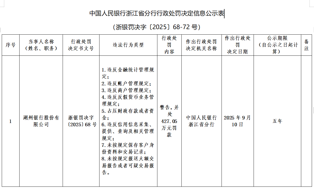 9月22日消息,中国人民银行浙江省分行行政处罚决定信息公示表显示,湖州银行因8项违法违规行为,被中国人民银行浙江省分行警告,并处427.05万元罚款。同时,4名相关责任人被罚,累计罚款17万元。