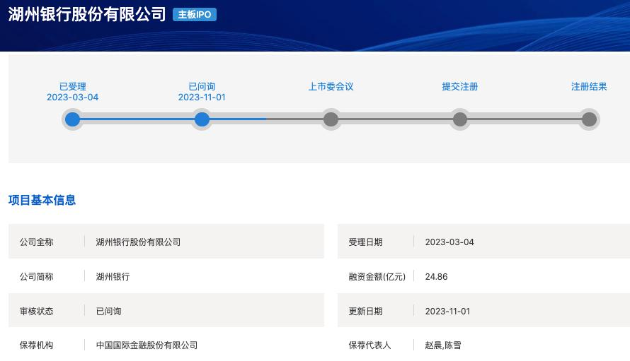 此后,随着A股发行注册制的全面铺开,湖州银行的首发申请于2023年3月份平移至上交所。2023年9月30日,财务资料过有效期被中止发行上市审核,当年11月1日,湖州银行再次更新财务资料,上交所恢复了对该行的发行上市审核。
